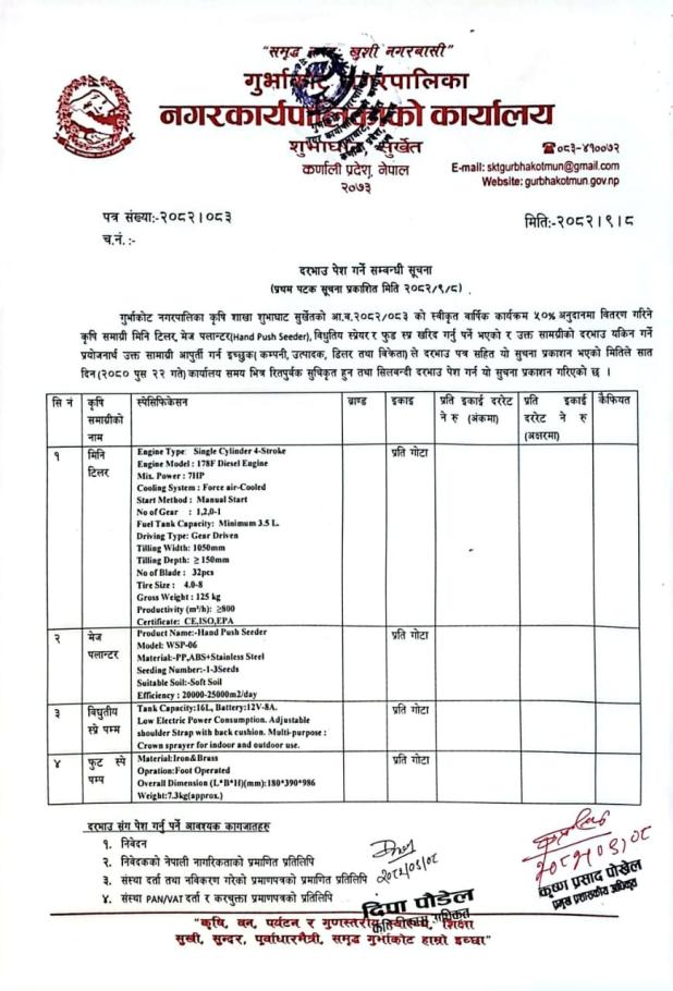५० प्रतिशत लागत साझेदारीमा कृषि यान्त्रिकरण कार्यक्रम संचालन सम्बन्धि सूचना ।