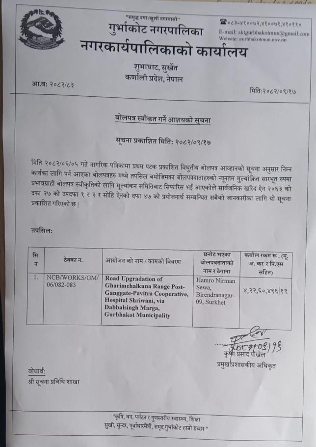 » बोलपत्र स्वीकृत गर्ने आशयको सूचना ।