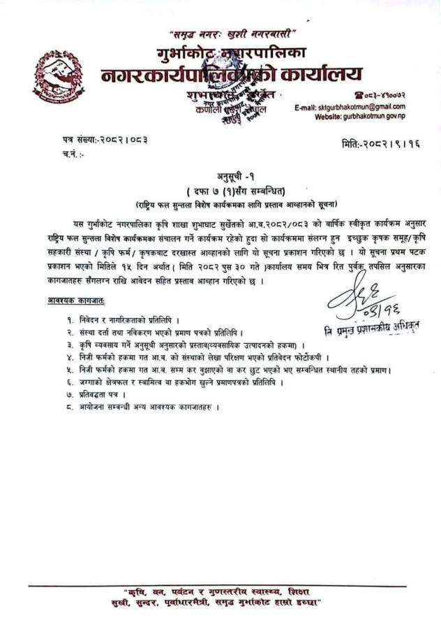 राष्ट्रिय फल सुन्तला विशेष कार्यक्रमको लागि प्रस्ताव आह्वान गरिएको सूचना ।