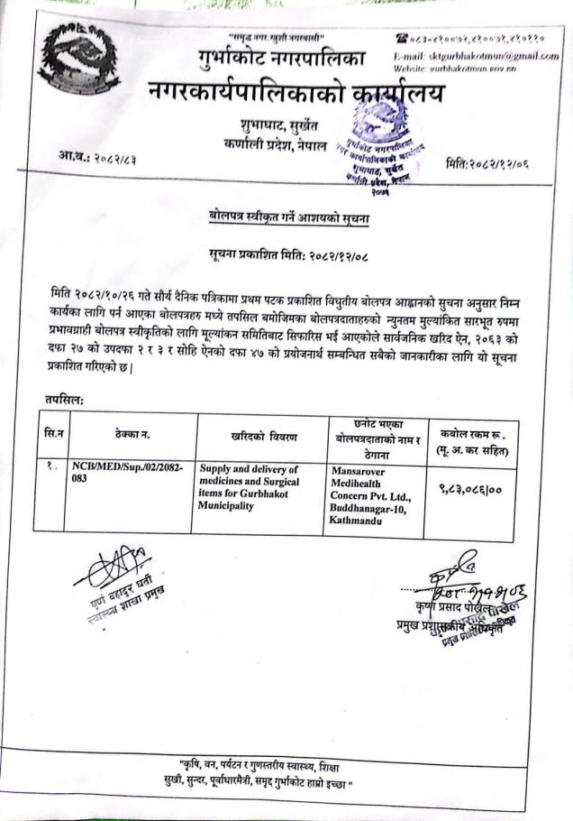 सार्वजनिक खरिद अन्तर्गत बोलपत्र स्वीकृति आशयको सूचना