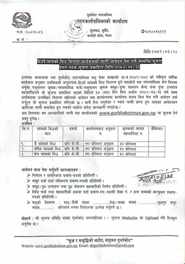 हिउँदे घांसको बीउ वितरण कार्यक्रमको लागि आवेदन पेश गर्ने सम्बन्धि सूचना ।
