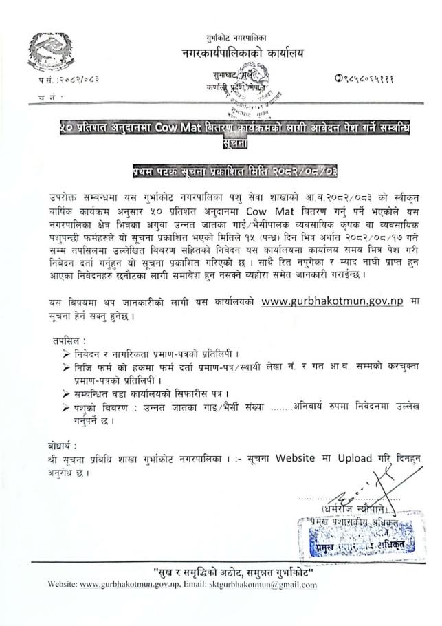 ५० प्रतिशत अनुदानमा Cow Mat वितरण कार्यक्रमको लागि आवेदन पेश गर्ने सम्बन्धि सूचना ।