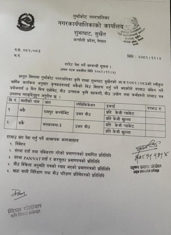 मकैको उन्नत बीउ खरिदका लागि दररेट पेश गर्ने सम्बन्धी सूचना