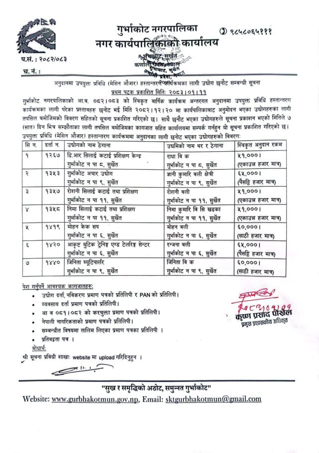 अनुदानमा उपयुक्त प्रविधि (मेशिन औजार) हस्तान्तरण कार्यक्रमका लागि उद्योग छनौट सम्बन्धी सूचना ।