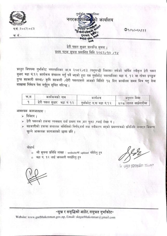 डेरी पसल सुधार वडा नं. १२ कार्यक्रम सञ्चालन सम्बन्धी सूचना