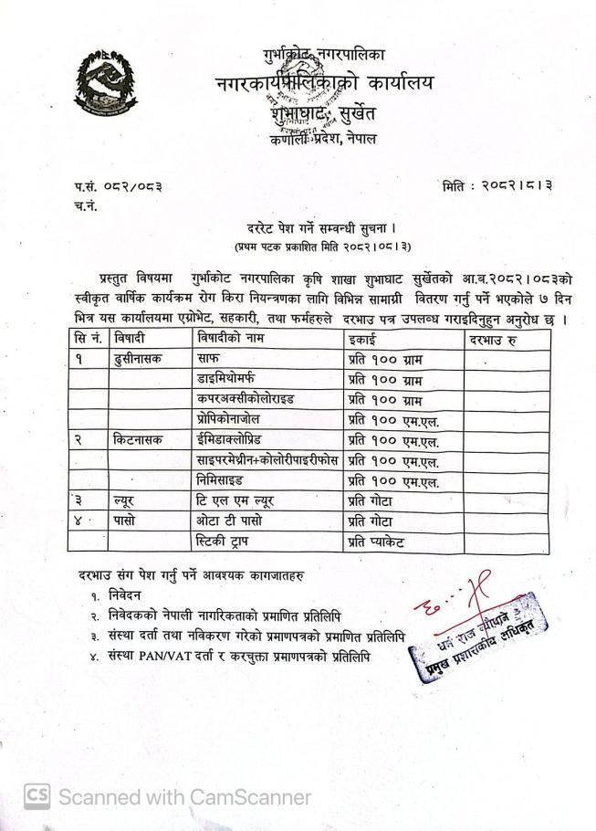 Cow Mat वितरणको लागि दरभाउ पेश गर्ने सम्बन्धि सूचना ।