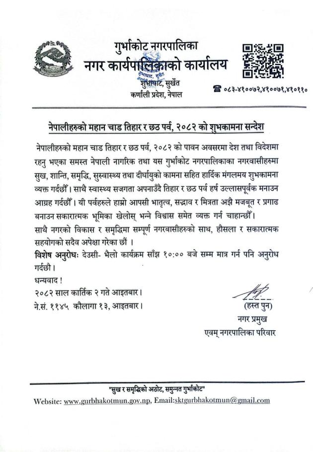नेपालीहरुको महान चाड तिहार र छठ पर्व, २०८२ को शुभकामना सन्देश