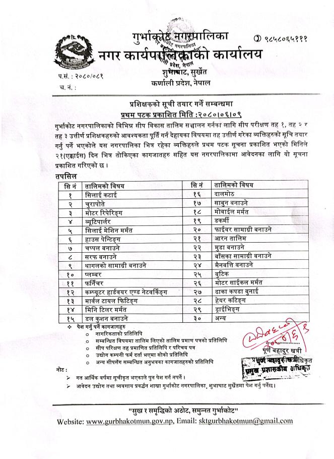 नगर कार्यपालिकाको कार्यालय, शुभाघाट, सुर्खेत, कर्णाली प्रदेश ,नेपाल ।