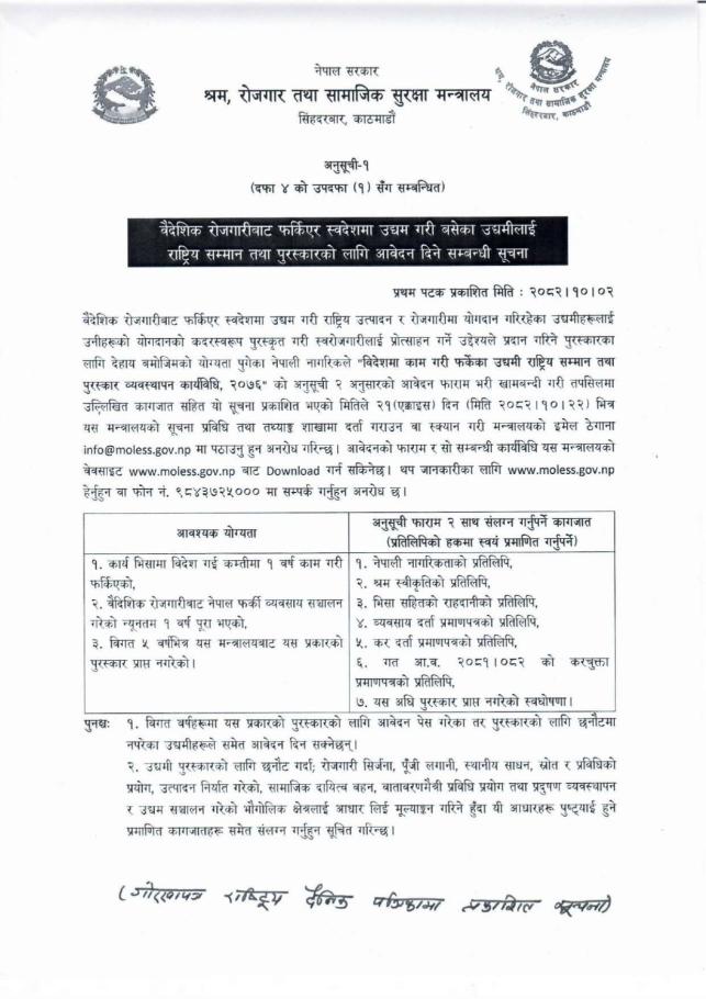 वैदेशिक रोजगारीबाट फर्किएर स्वदेशमै उद्यम गरी योगदान गरेका उद्यमीलाई राष्ट्रिय सम्मान तथा पुरस्कारका लागि आवेदन दिने सम्बन्धी सूचना।