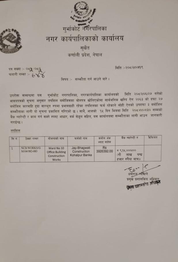 नगर कार्यपालिकाको कार्यालय, शुभाघाट, सुर्खेत, कर्णाली प्रदेश ,नेपाल ।