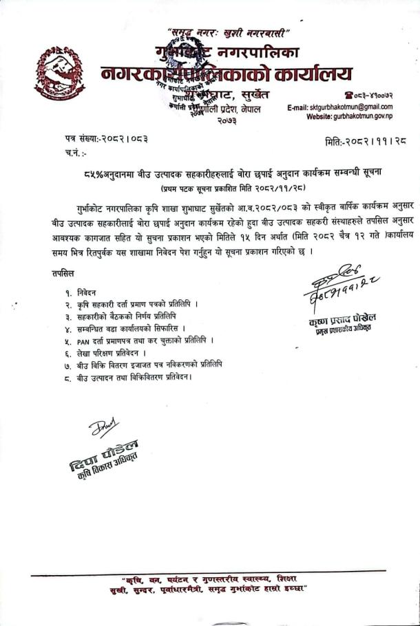 ८५% अनुदानमा बीउ उत्पादक सहकारीहरुलाई वोरा छपाई अनुदान कार्यक्रम सम्बन्धी सूचना ।