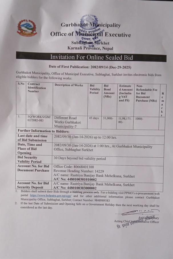 नगर कार्यपालिकाको कार्यालय, शुभाघाट, सुर्खेत, कर्णाली प्रदेश ,नेपाल ।