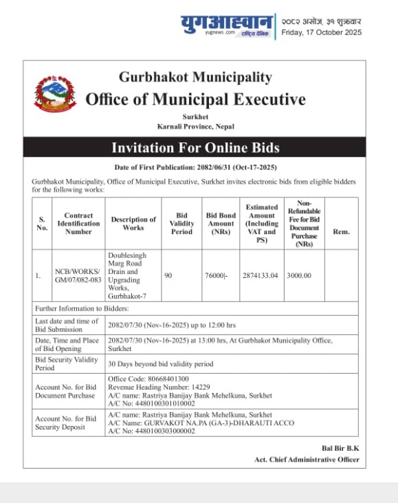 नगर कार्यपालिकाको कार्यालय, शुभाघाट, सुर्खेत, कर्णाली प्रदेश ,नेपाल ।